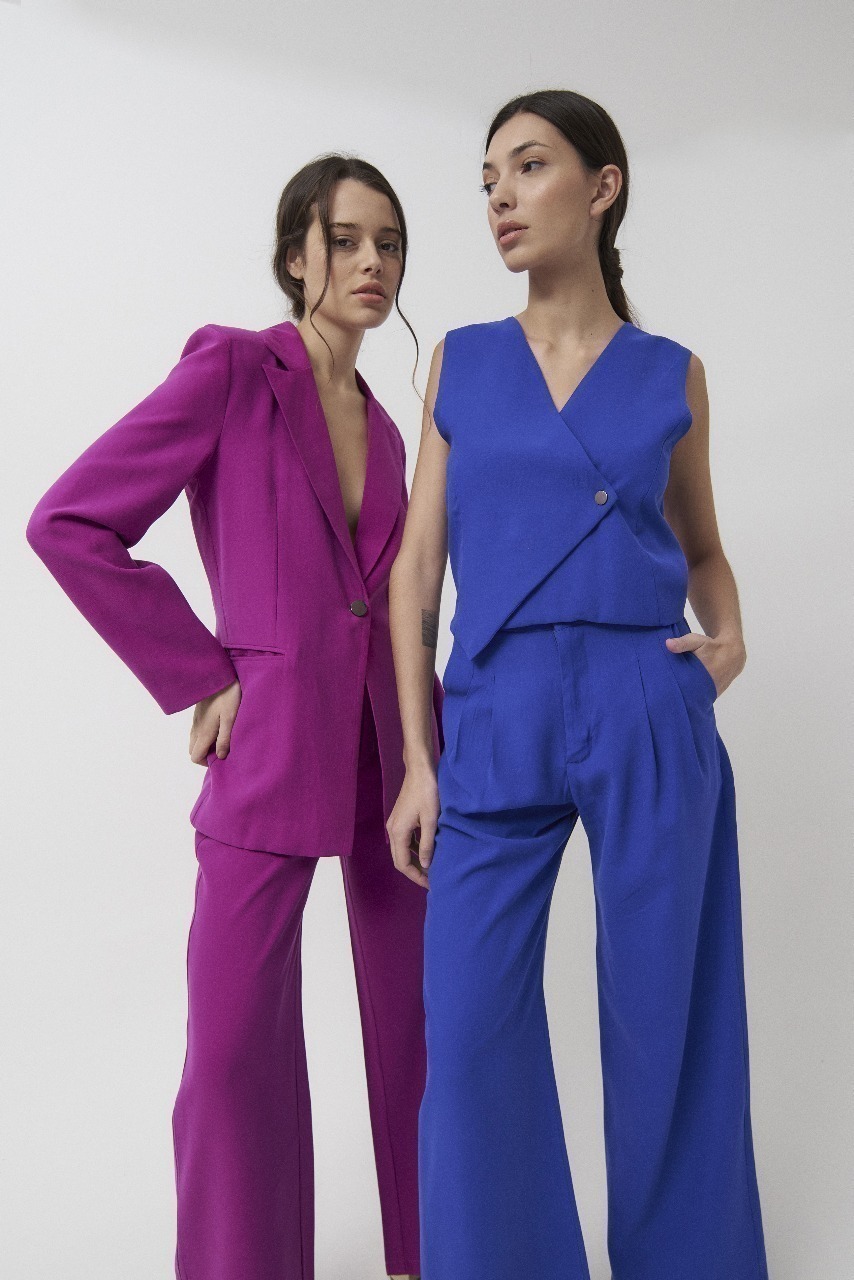 Chaleco de twill corte asimétrico con botón de metal y ferrería interna de algodón satinado.