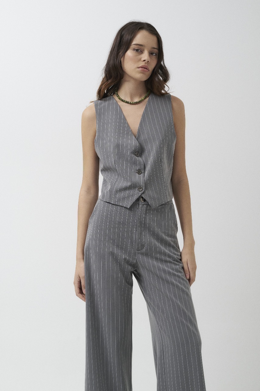 Chaleco tela twill, con forrería interna, botones en metal, tira de ajuste en espalda y pasador en zamak.